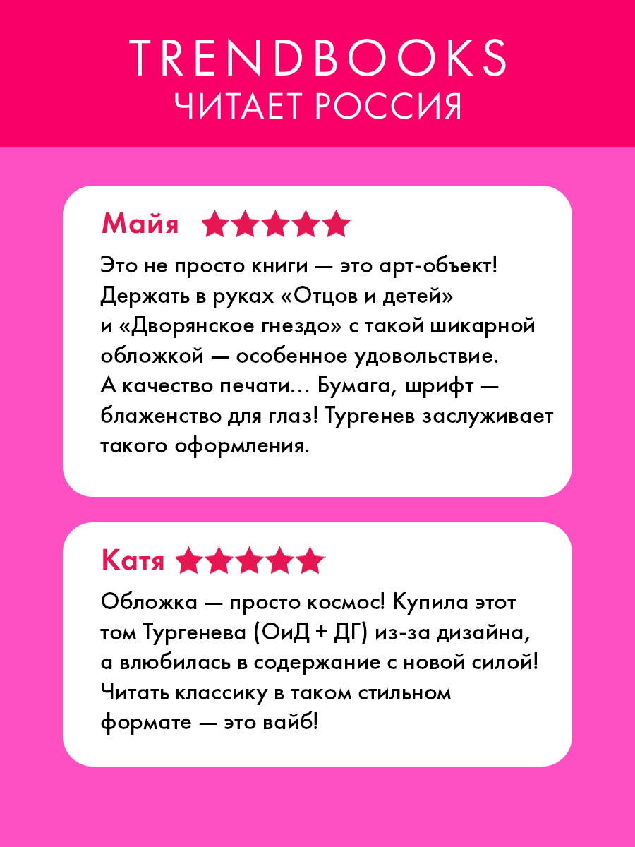 Культовая классика русской литературы — романы Ивана Сергеевича Тургенева «Отцы и дети» и «Дворянское гнездо» в современном оформлении от редакции Trendbooks. Вечные вопросы, любовь, непревзойденный психологизм, сила тургеневского слова в идеальном дуэте, раскрывающем душу России XIX века.
