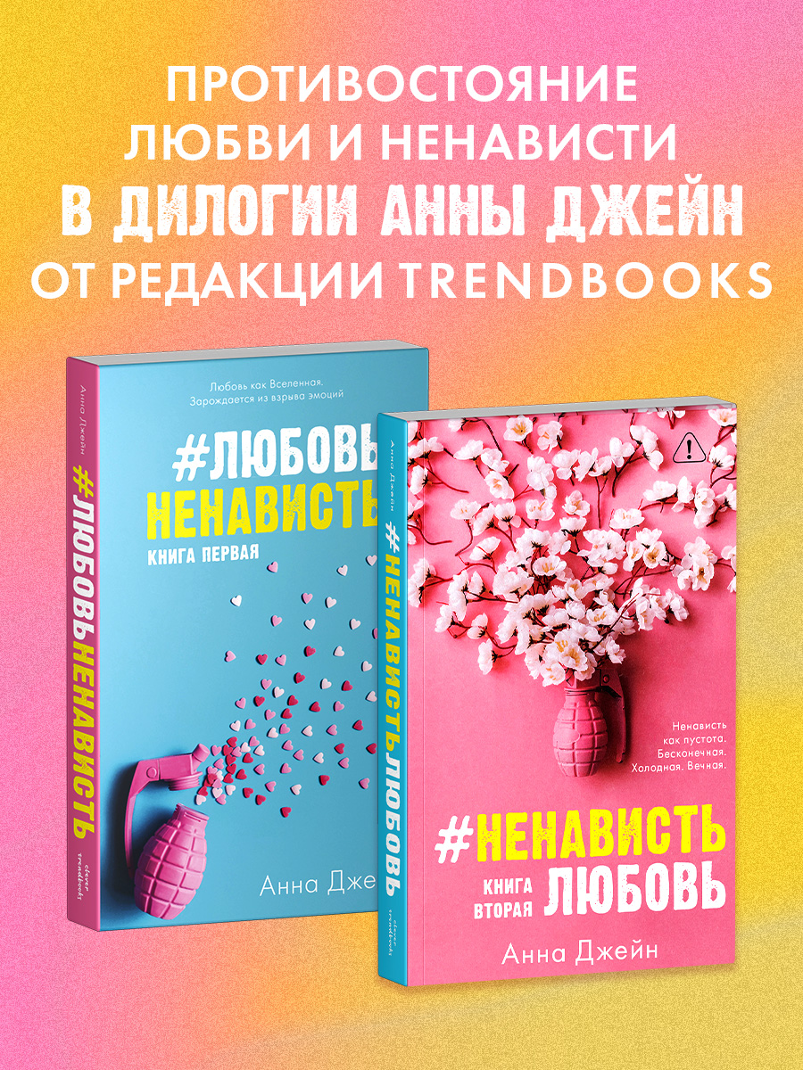 Комплект популярных книг Анны Джейн “ЛюбовьНенависть” и “НенавистьЛюбовь” — история, которая заставит переживать судьбы героев, что проходят путь “от ненависти до любви”, смеяться и плакать, надеяться и, затаив дыхание, следить за головокружительными поворотами сюжета. Книги станут восхитительным подарком для подростков (16+) и взрослых любителей Young Adult литературы. Бестселлеры, покорившие сердца множества читателей, создадут праздничное настроение и обязательно понравятся вашей любимой девушке, женщине, подруге, сестре или маме. “ЛюбовьНенависть” и “НенавистьЛюбовь” прекрасно дополнят подарочный набор на день рождения, 8 Марта, День святого Валентина (14 февраля), Новый год (НГ) и любой другой праздник. Романтические книги Анны “Наследница Черного дракона”, “Тайна Черного дракона”, “Звезда Черного дракона”, “Кошмарных снов, любимая”, “Подарок ангела”, “Влюбленная ведьма”, “Восхитительная ведьма”, “Поклонник”, “Твое сердце будет разбито”, “По осколкам твоего сердца”, “Запрети любить” и другие от редакции Trendbooks — это качественная современная художественная проза, на страницах которой любовные линии и романтика соседствуют с искрометным юмором, интригами и тайнами.