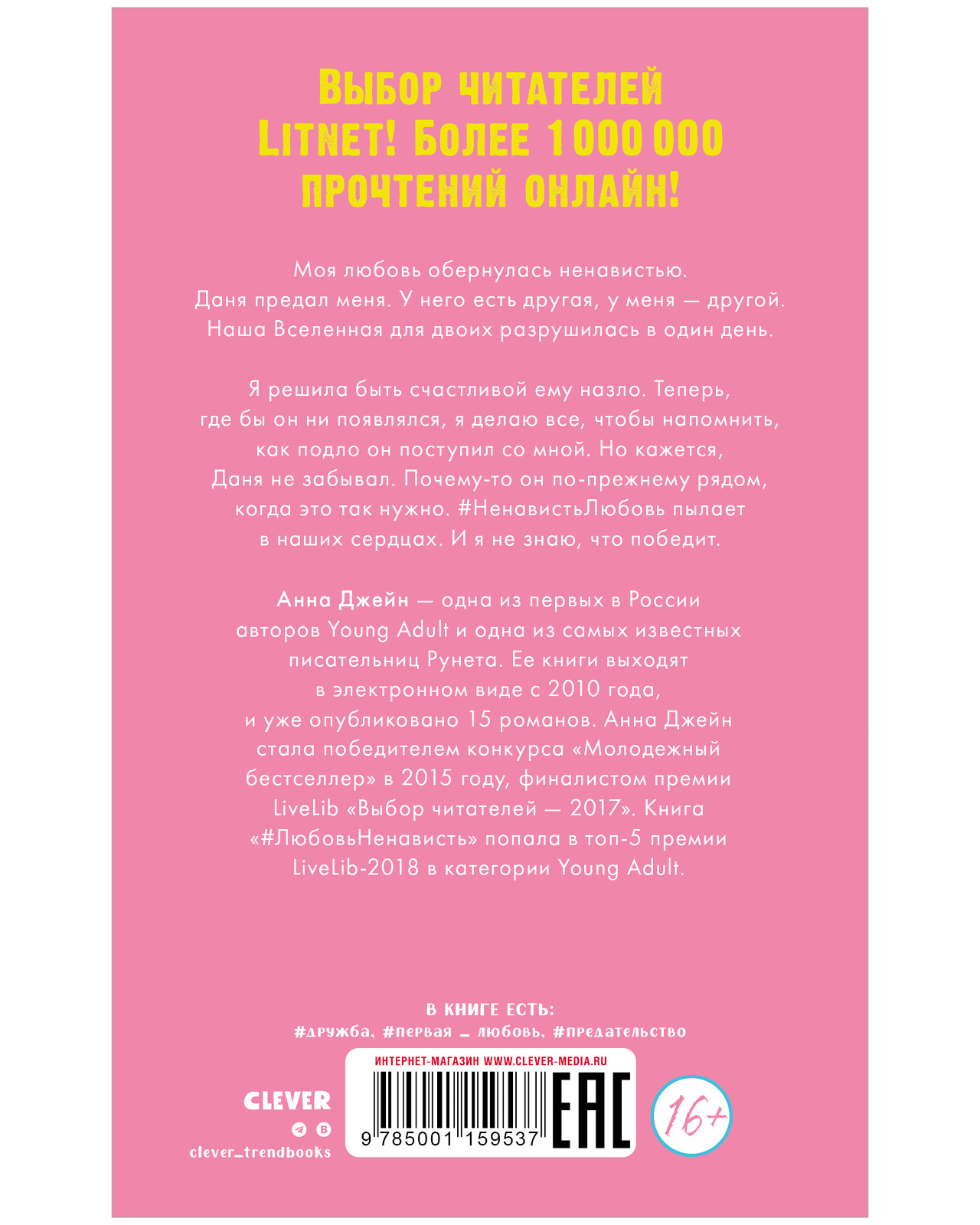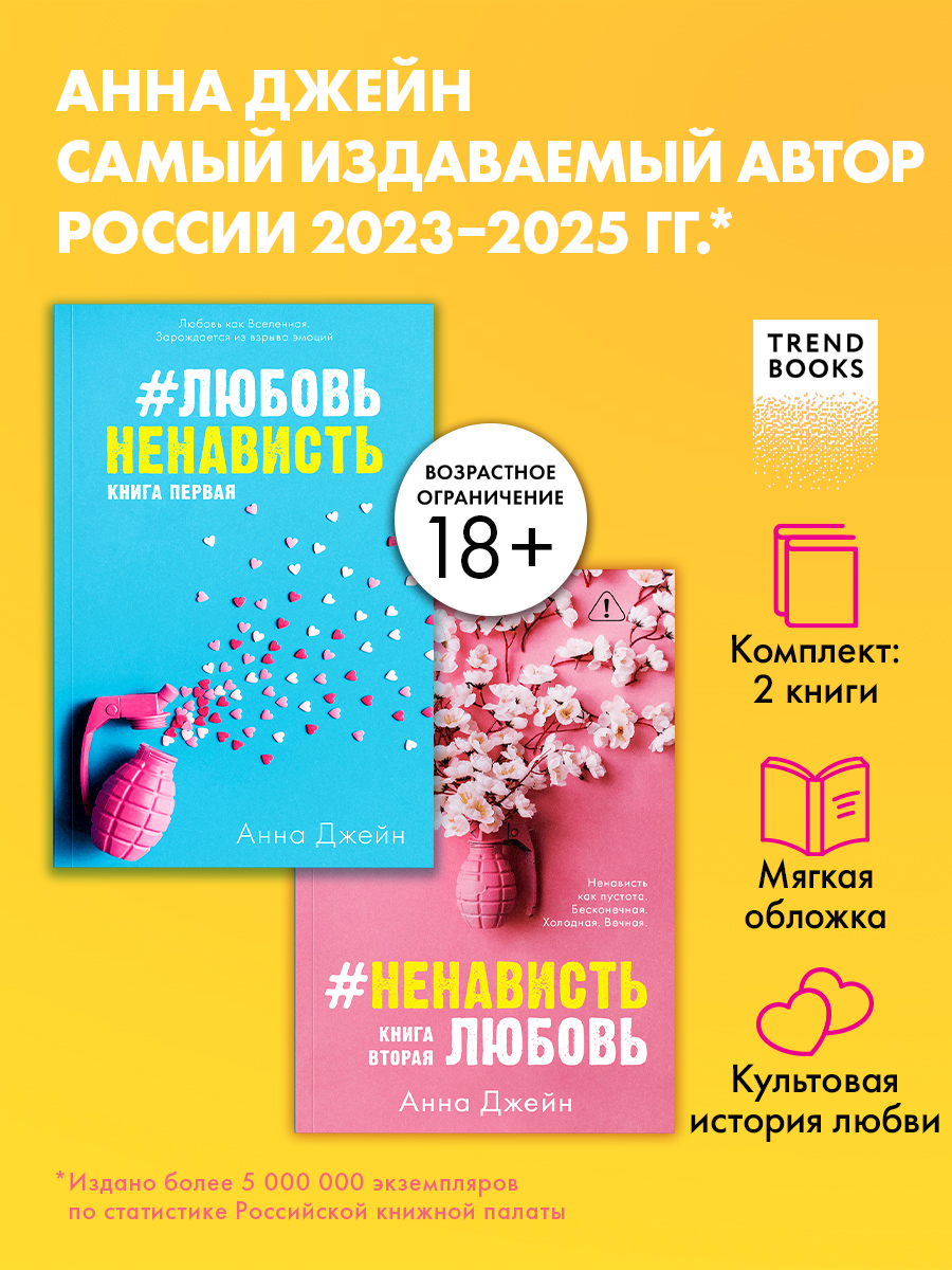 Комплект популярных книг Анны Джейн “ЛюбовьНенависть” и “НенавистьЛюбовь” — история, которая заставит переживать судьбы героев, что проходят путь “от ненависти до любви”, смеяться и плакать, надеяться и, затаив дыхание, следить за головокружительными поворотами сюжета. Книги станут восхитительным подарком для подростков (16+) и взрослых любителей Young Adult литературы. Бестселлеры, покорившие сердца множества читателей, создадут праздничное настроение и обязательно понравятся вашей любимой девушке, женщине, подруге, сестре или маме. “ЛюбовьНенависть” и “НенавистьЛюбовь” прекрасно дополнят подарочный набор на день рождения, 8 Марта, День святого Валентина (14 февраля), Новый год (НГ) и любой другой праздник. Романтические книги Анны “Наследница Черного дракона”, “Тайна Черного дракона”, “Звезда Черного дракона”, “Кошмарных снов, любимая”, “Подарок ангела”, “Влюбленная ведьма”, “Восхитительная ведьма”, “Поклонник”, “Твое сердце будет разбито”, “По осколкам твоего сердца”, “Запрети любить” и другие от редакции Trendbooks — это качественная современная художественная проза, на страницах которой любовные линии и романтика соседствуют с искрометным юмором, интригами и тайнами.