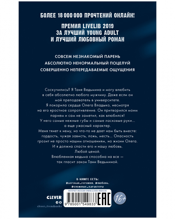 Соскучились? Студентка Таня Ведьмина может влюбить в себя абсолютно любого мужчину. Даже если он – ее преподаватель в университете. Она покорила сердце Олега Владыко несмотря на его яростное сопротивление. Он притворился ее парнем и сам не заметил как влюбился! У него самые нежные губы и самые ласковые руки…а еще ужасный характер. Таню тянет к нему, но что-то не дает им быть вместе: гордость, чужая зависть, ложь, месть…Опасность грозит не просто их отношениям, но жизни Олега. И Таня должна спасти свою любовь. Любой ценой. Влюбленная ведьма способна на все – так гласит закон Тани Ведьминой.