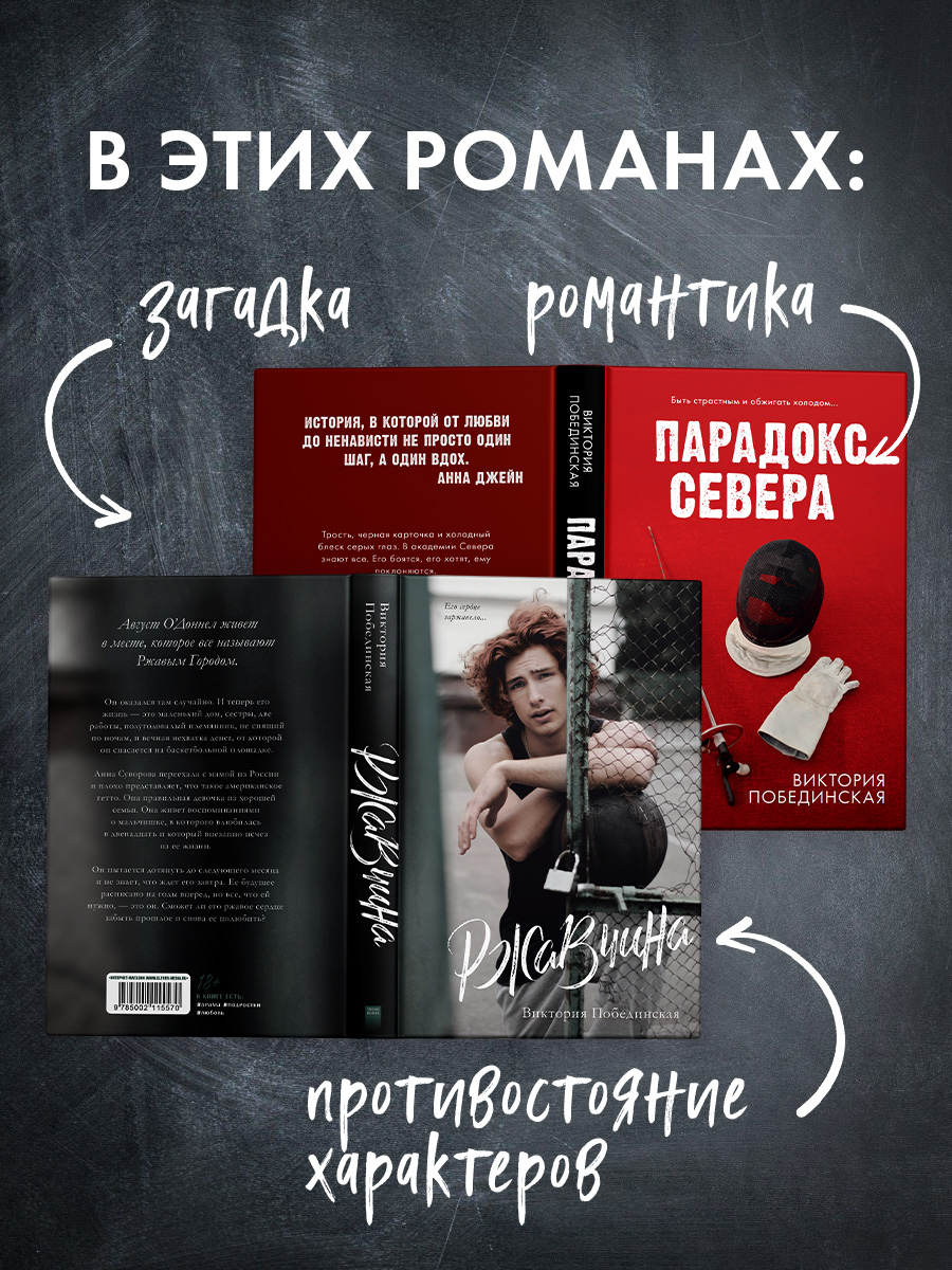 Комплект "Парадокс Севера" и "Ржавчина"- романы, которые подарят незабываемые эмоции и покорят живыми и “неидеальными” персонажами, сильными чувствами и головокружительными сюжетными поворотами. Каждая сцена из книг Виктории Побединской прописана так точно и детально, что истории можно “смотреть”, представляя и проживая каждое действие героев, как свое собственное.