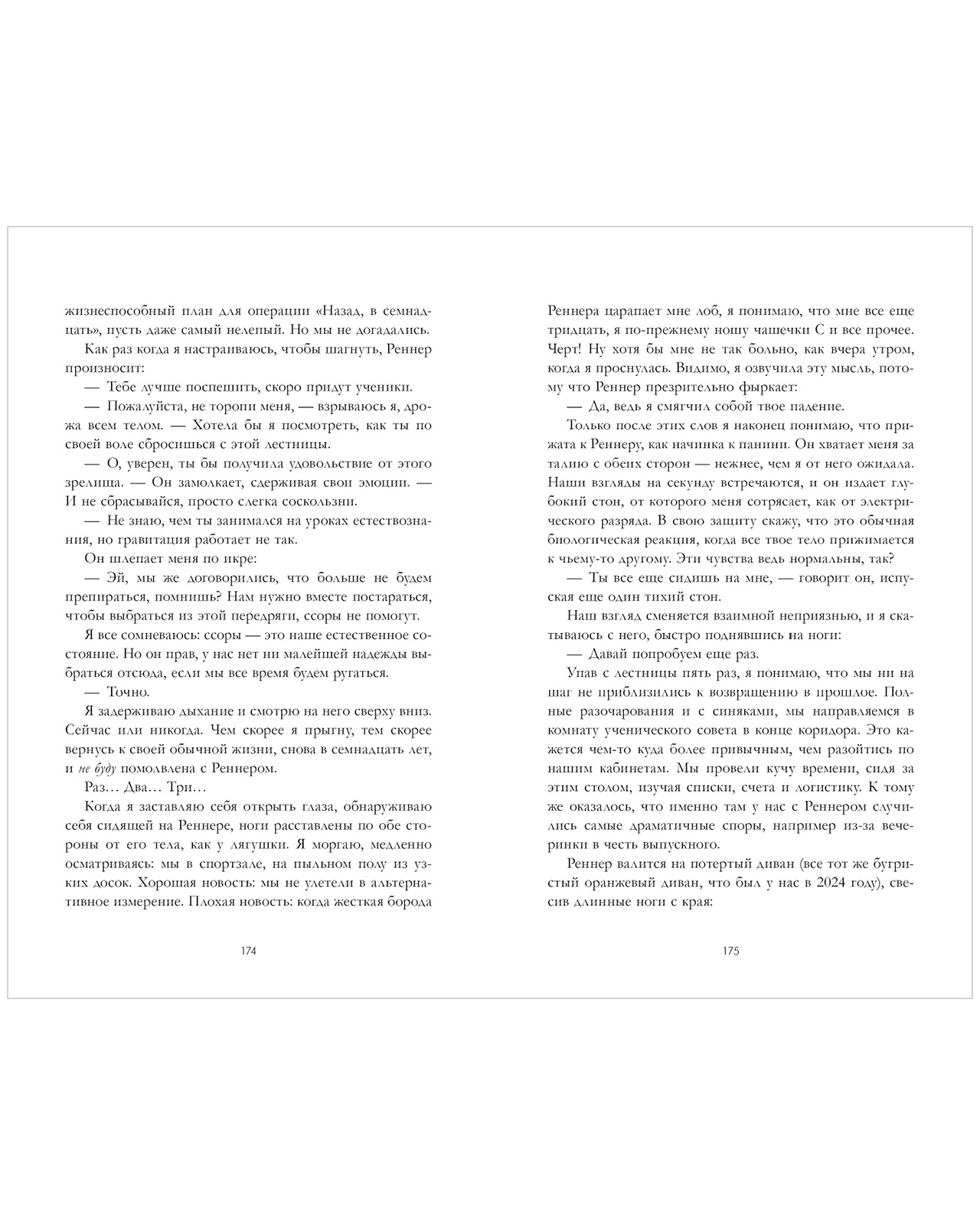 «Быть главой комитета по организации выпускного — то, что я планировала с девятого класса. Упасть с лестницы, потерять сознание и перенестись во времени — последнее, что могло со мной случиться. Каким‑то образом я перескочила тринадцать лет своей жизни и очнулась тридцатилетней. К тому же помолвленной со своим заклятым школьным врагом Джей-Ти Реннером.