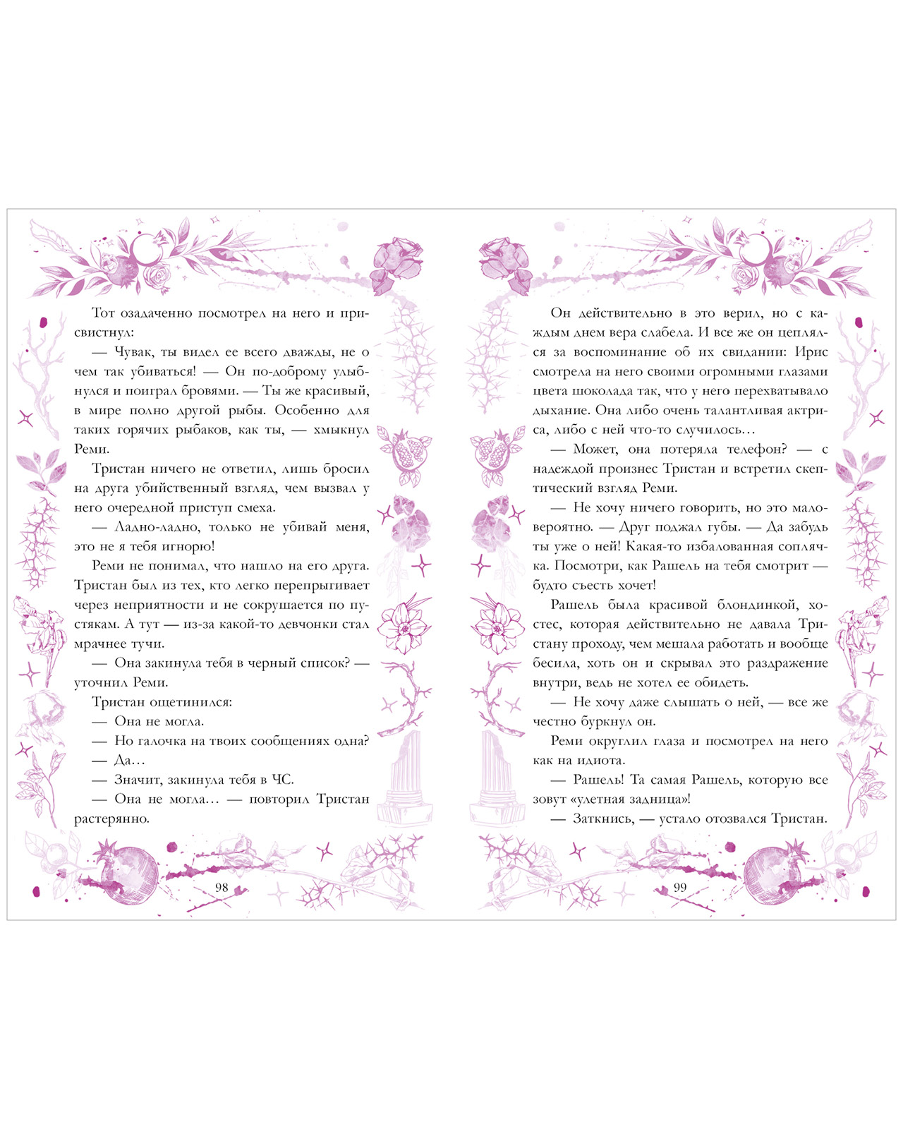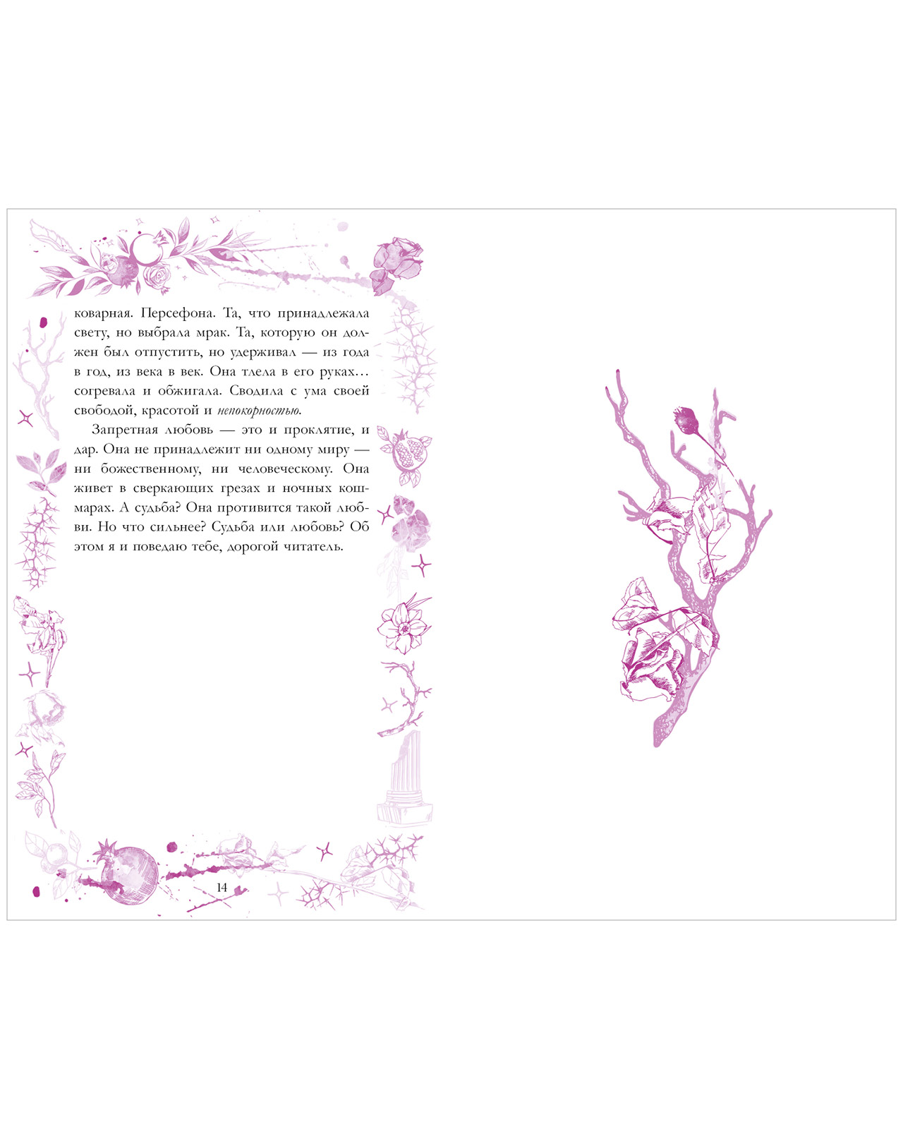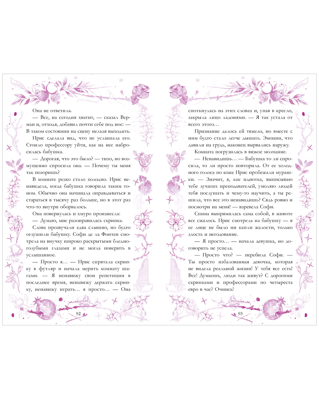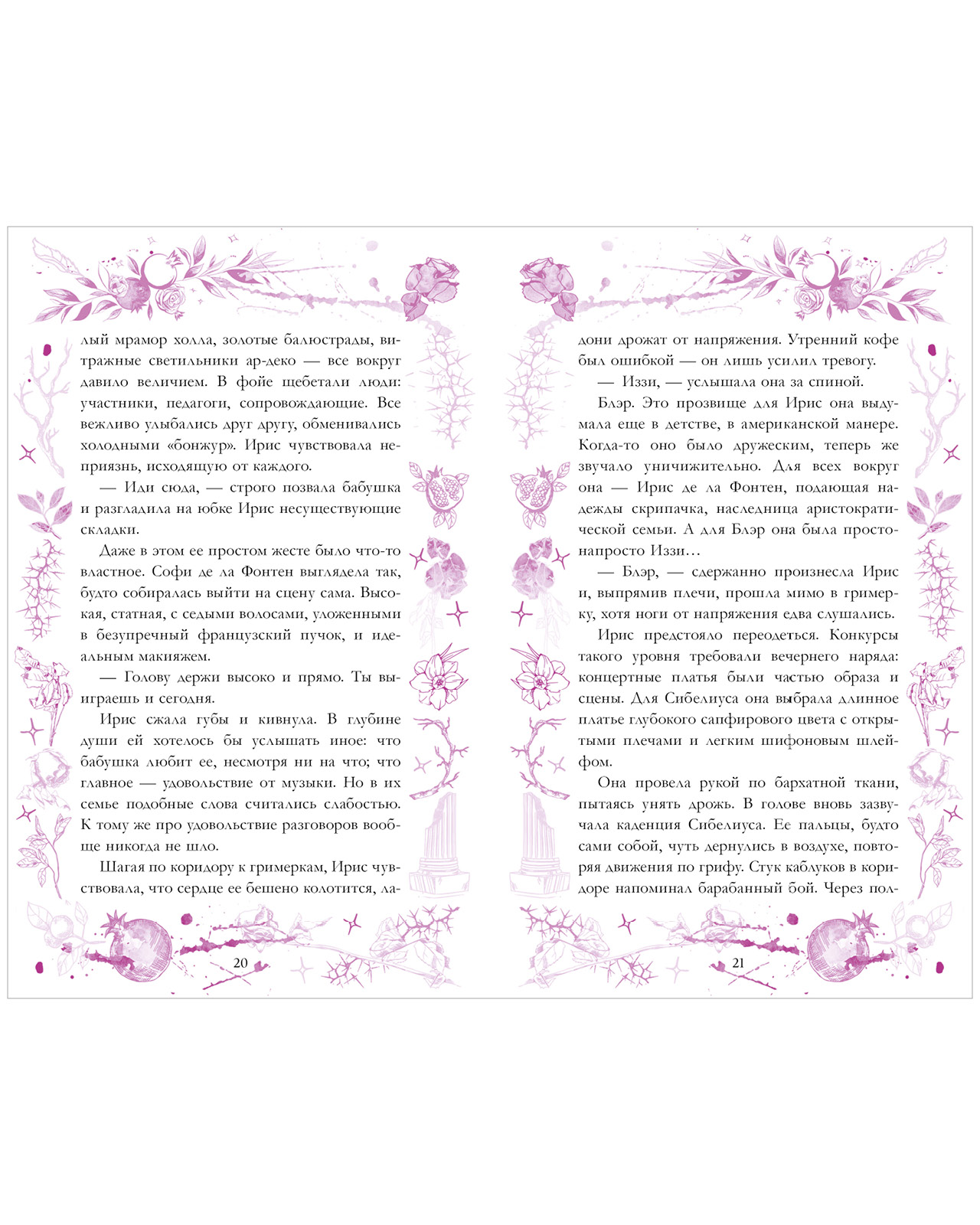 ● Нежные пурпурные иллюстрации и узоры на страницах книги