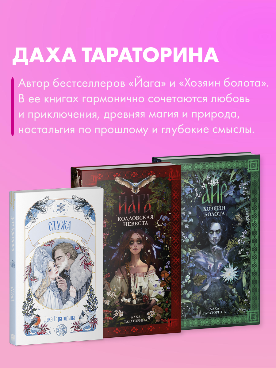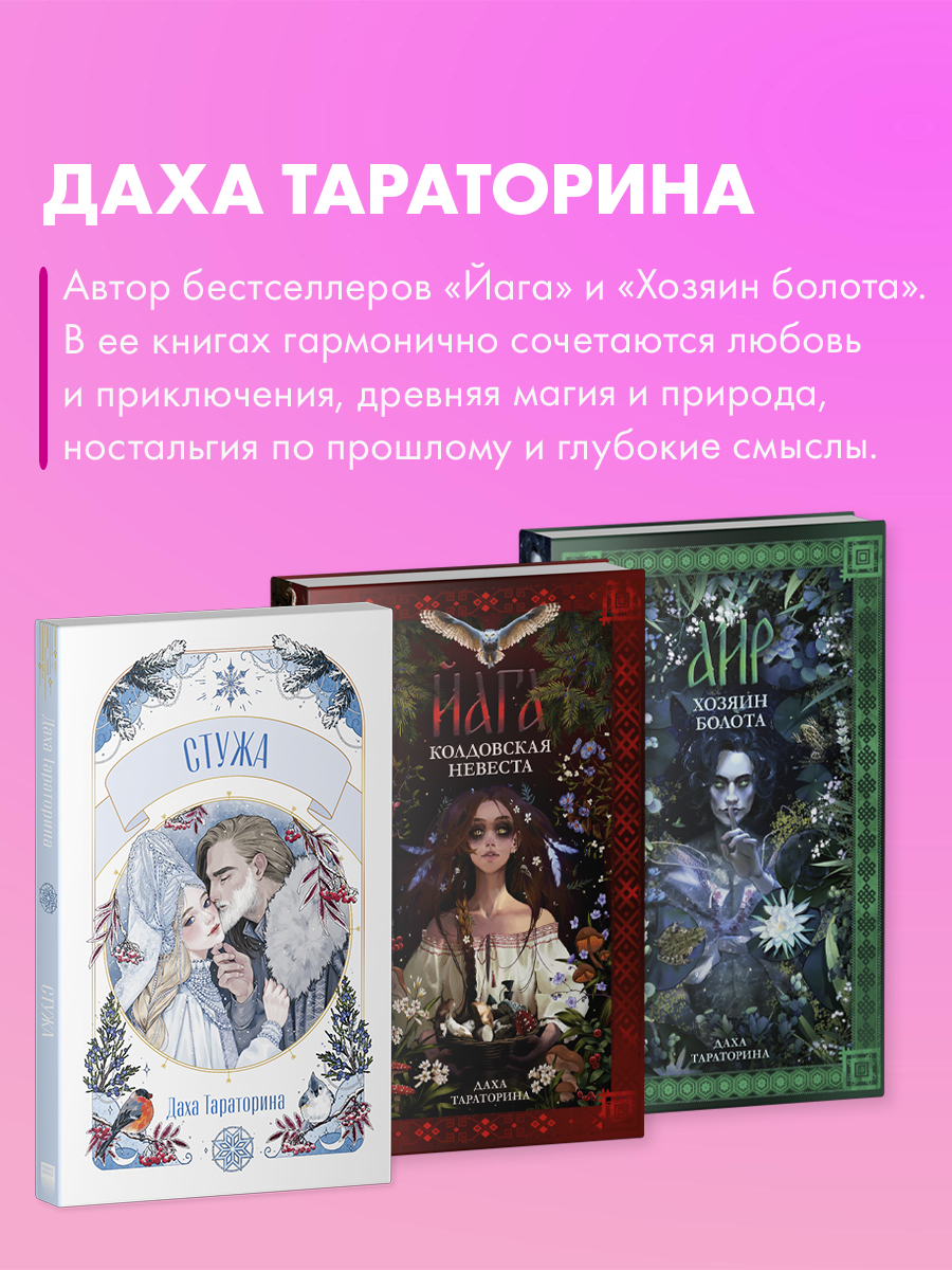 Если вы ищете романы о любви с зимней атмосферой, интересные книги в жанре деревенского фэнтези и любите романы Дахи Тараториной, новелла «Стужа» для вас. Книги про любовь этой серии легко прочитать за вечер — это идеальные книги, интересные на выходные.