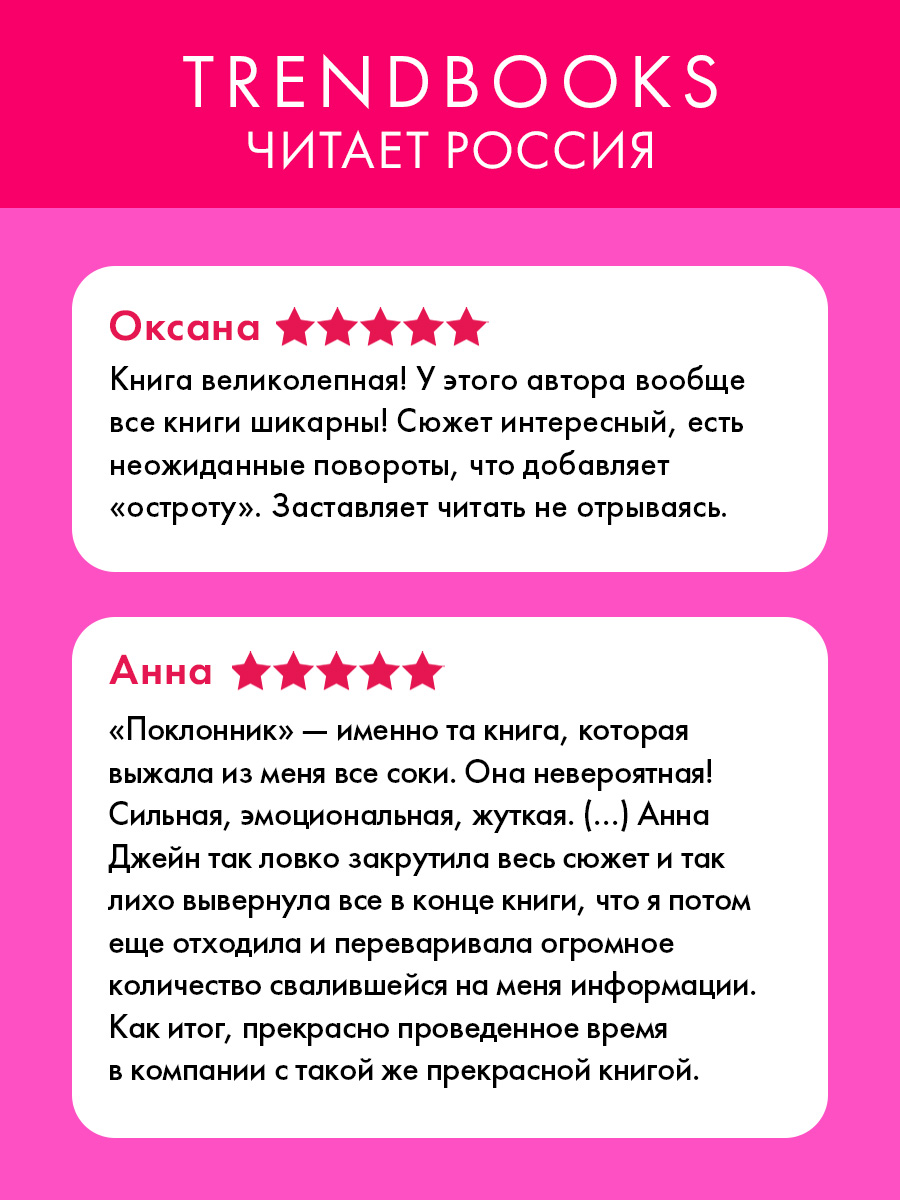 Поклонник Анна Джейн — идеальный подарок для всех, кто любит книги Анны Джейн, романы, нагнетающие саспенс, интересные книги, в которых любовь сочетается с детективной интригой, и книги про любовь для взрослых (книги 18+). Такая художественная литература понравится тем, кого интересуют книги по психологии, Анна Джейн книги и книги романы с тревожной атмосферой.