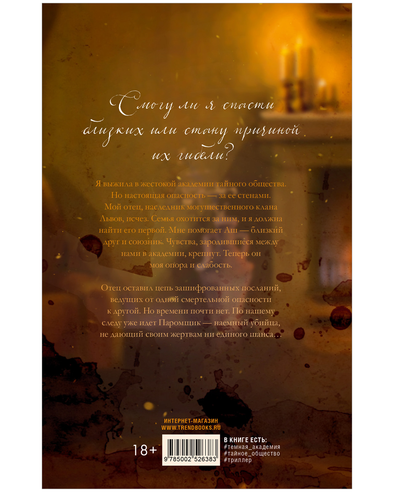 «Я выжила в жестокой академии тайного общества. Но настоящая опасность — за ее стенами. Мой отец, наследник могущественного клана Львов, исчез. Семья охотится за ним, и я должна найти его первой. Мне помогает Аш — близкий друг и союзник. Чувства, зародившиеся между нами в академии, крепнут. Теперь он моя опора и слабость.