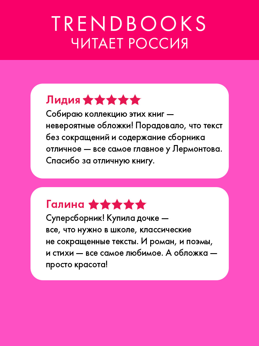 На страницах этой красивой книги для подростков вы найдете тексты в полном, не сокращенном варианте — художественная литература, все, что нужно для школьной и университетских программ. Сборник главных произведений Михаила Юрьевича Лермонтова выходит в коллекционном издании от Trendbooks.
